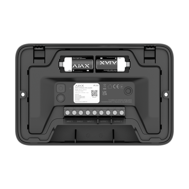 EN54 I/O Module (2X2) Jeweller on juhtmevaba aadressitav sisend- ja väljundmoodul, millel on kaks sisendit ja kaks väljundit (relee), et võimaldada kolmandate osapoolte seadmete juhtimist ning seeläbi laiendada Ajax süsteemi funktsionaalsust. Seade vastab olulistele Euroopa tuleohutusstandarditele: EN 54-18 (sisend-/väljundseadmed), EN 54-25 (raadioside) ja elektroonilise side direktiivile RED (2014/53/EU)