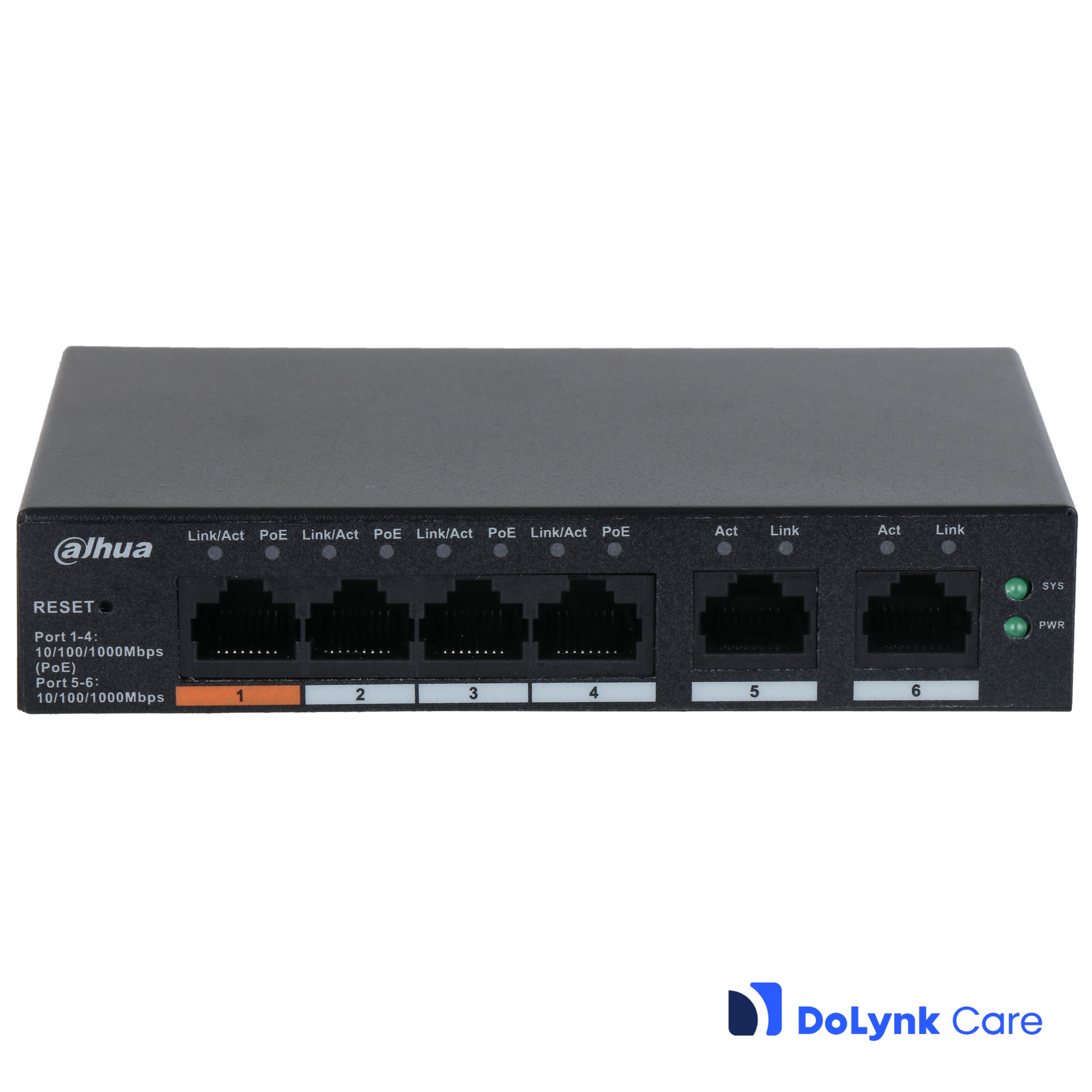 - Pordid • 1-4 RJ-45 10/100/1000 Mbps (PoE); Pordid 5, 6 RJ-45 10/100/1000 Mbps (uplink)