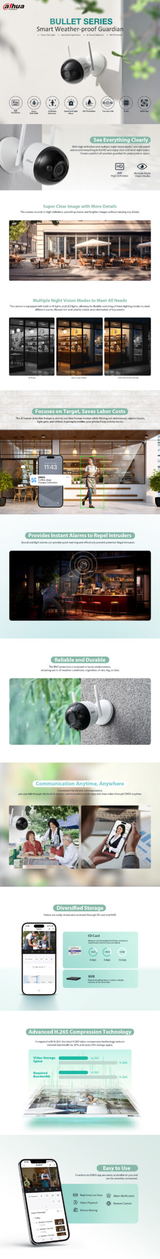 Väga soodsa hinnaga Dahua Wireless Bullet F4C-PV on välitingimustesse sobiv kodukasutaja kaamera kahepoolse audio sidega ning heidutusvõimekusega. Kaamera lisamine süsteemi on tänu bluetooth olemasolule väga lihtne ja kiire. Äpis on võimalik ka jagada ligipääsu kaamerale.