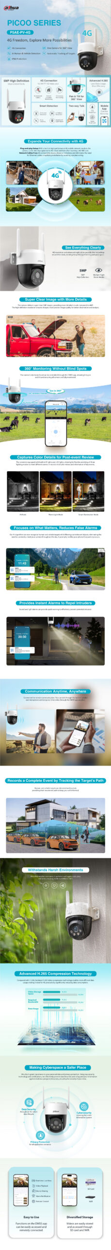 Väga soodsa hinnaga Dahua Wireless Picoo P5AE-PV-4G kodukasutaja kaamera eemalt juhtimise võimekusega ja kahepoolse audio sidega. Tänu sõidukite ja inimeste AI abiga avastamisele kaadrist on kaamera tõhus abiline väiksema territooriumi valvamiseks. Kaamera lisamine süsteemi on tänu bluetooth olemasolule väga lihtne ja kiire. Äpis on võimalik ka jagada täiendavat ligipääsu kaamerale. Sobib ideaalselt kasuramiseks kohtades, kus puudub wi-fi ja pole ka LAN võrku